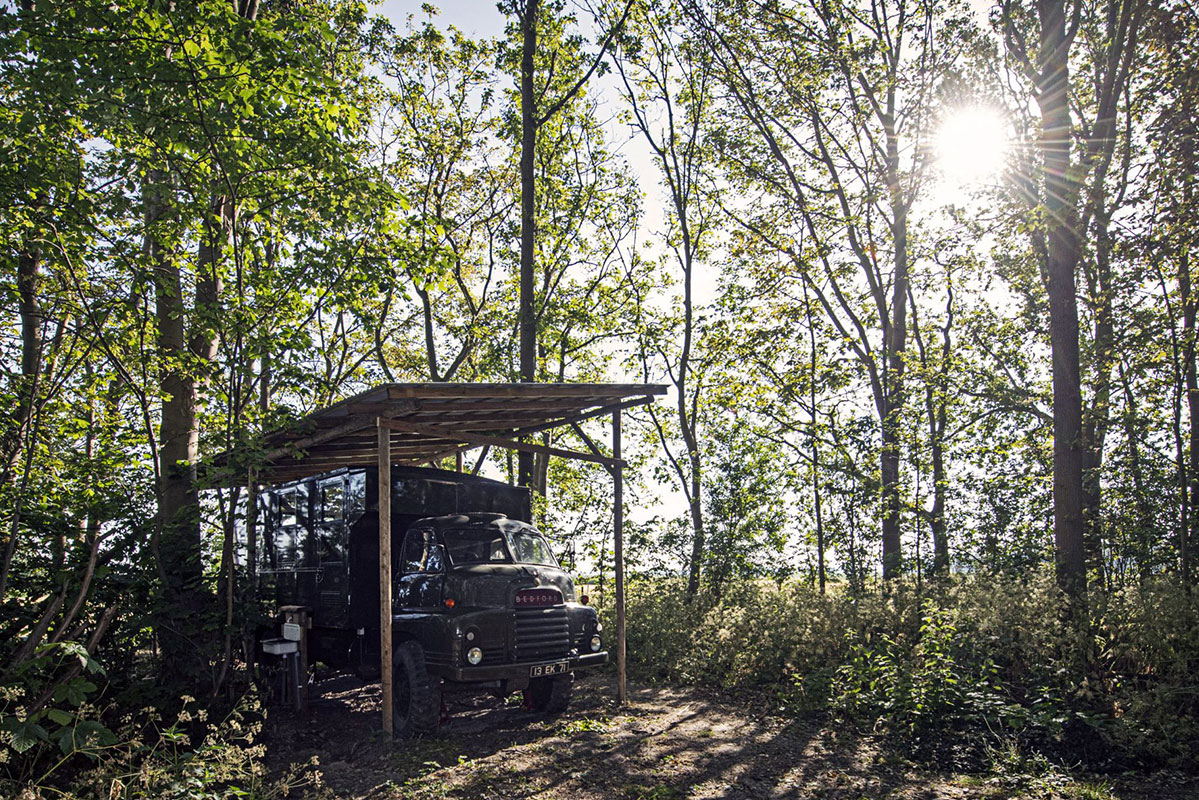 Rondom de truck vind je het bos en velden met paarden. Het strand ligt op een paar kilometer afstand. Dit plekje is daarom voor de wandelaars een geweldige locatie.